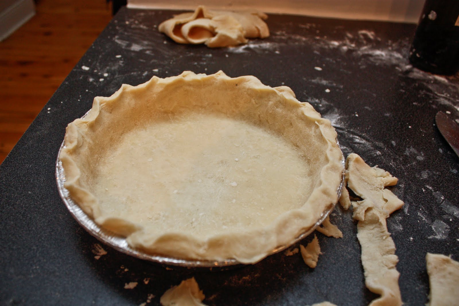 Sift together the salt and flour into a large bowl. Using 2 knives, a pastry cutter or your hands, quickly work in the fats to create a ragged dough with visible lumps. Beat together the egg, vinegar and enough water to obtain 1 1/3 cups total of liquid. Add to the dough and mix until it comes together loosely. Turn over onto the counter and separate into 2 balls. Form into discs with your hands and wrap tightly with saran wrap. Each ball will make enough dough for a bottom and top crust. Refrigerate for at least 1 hour before using. Because this dough can be refrigerated for several days or frozen for several months, why not make a double batch and freeze half for later? Use some to try out our pear and pecan frangipane tart.